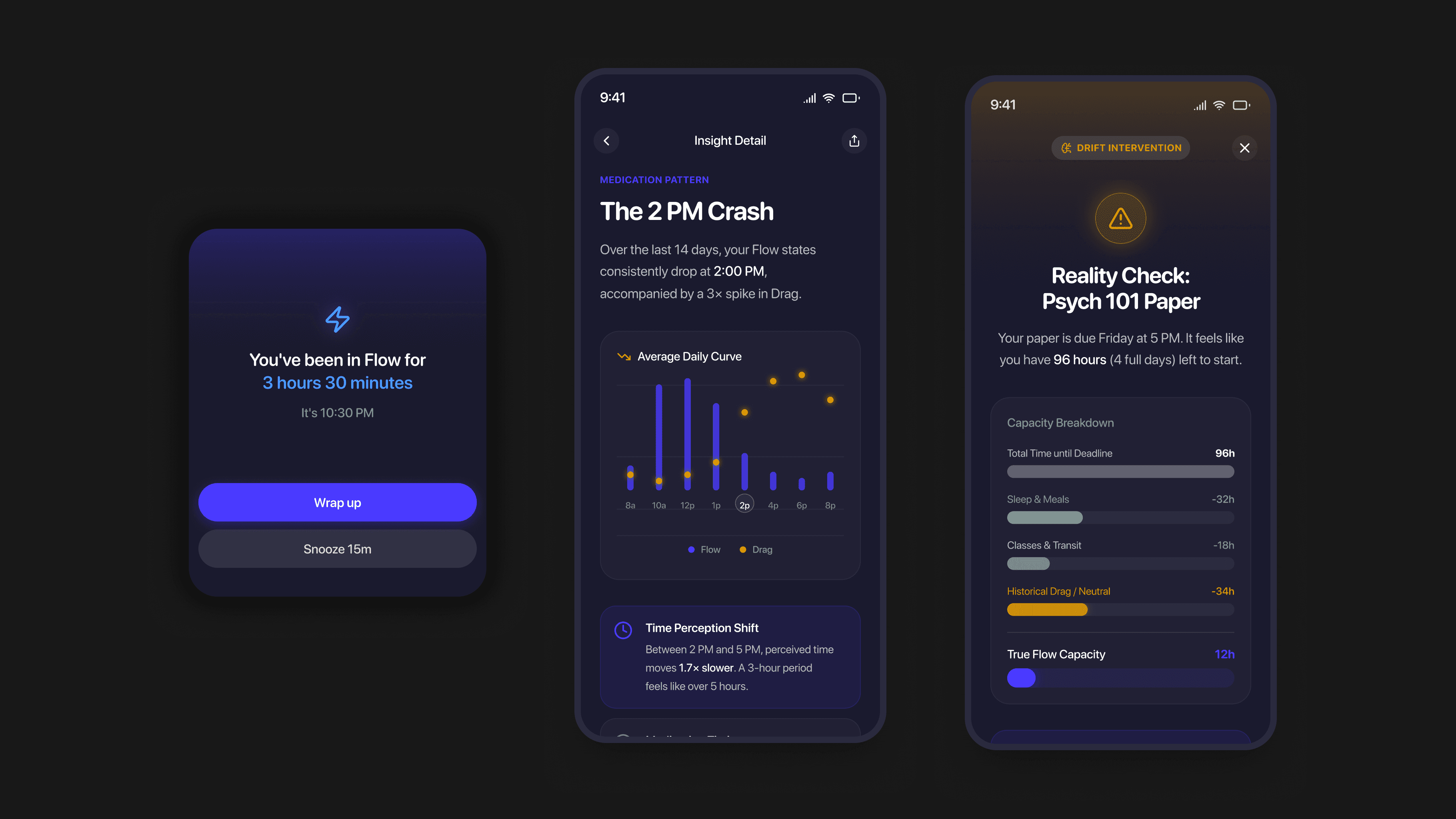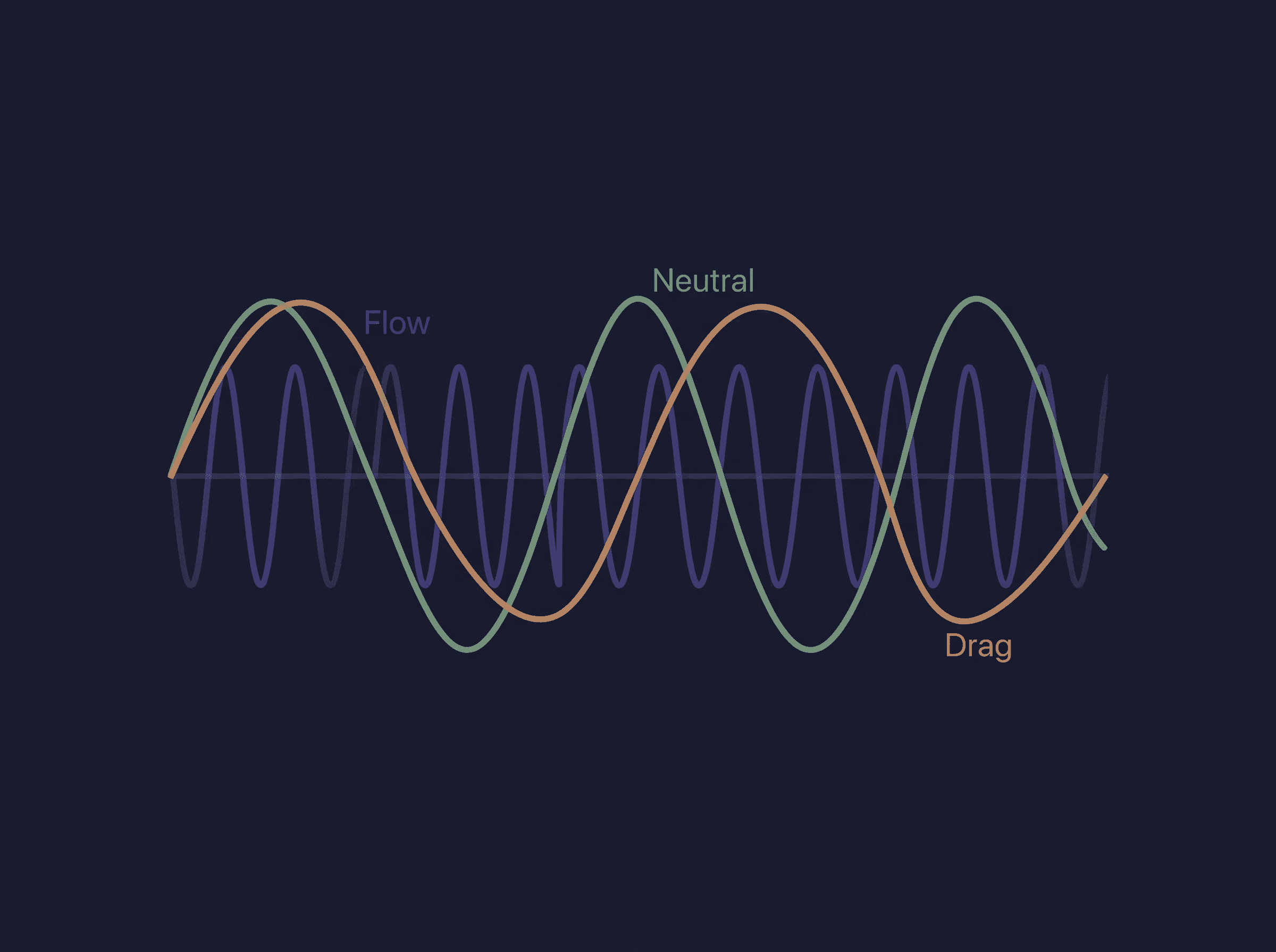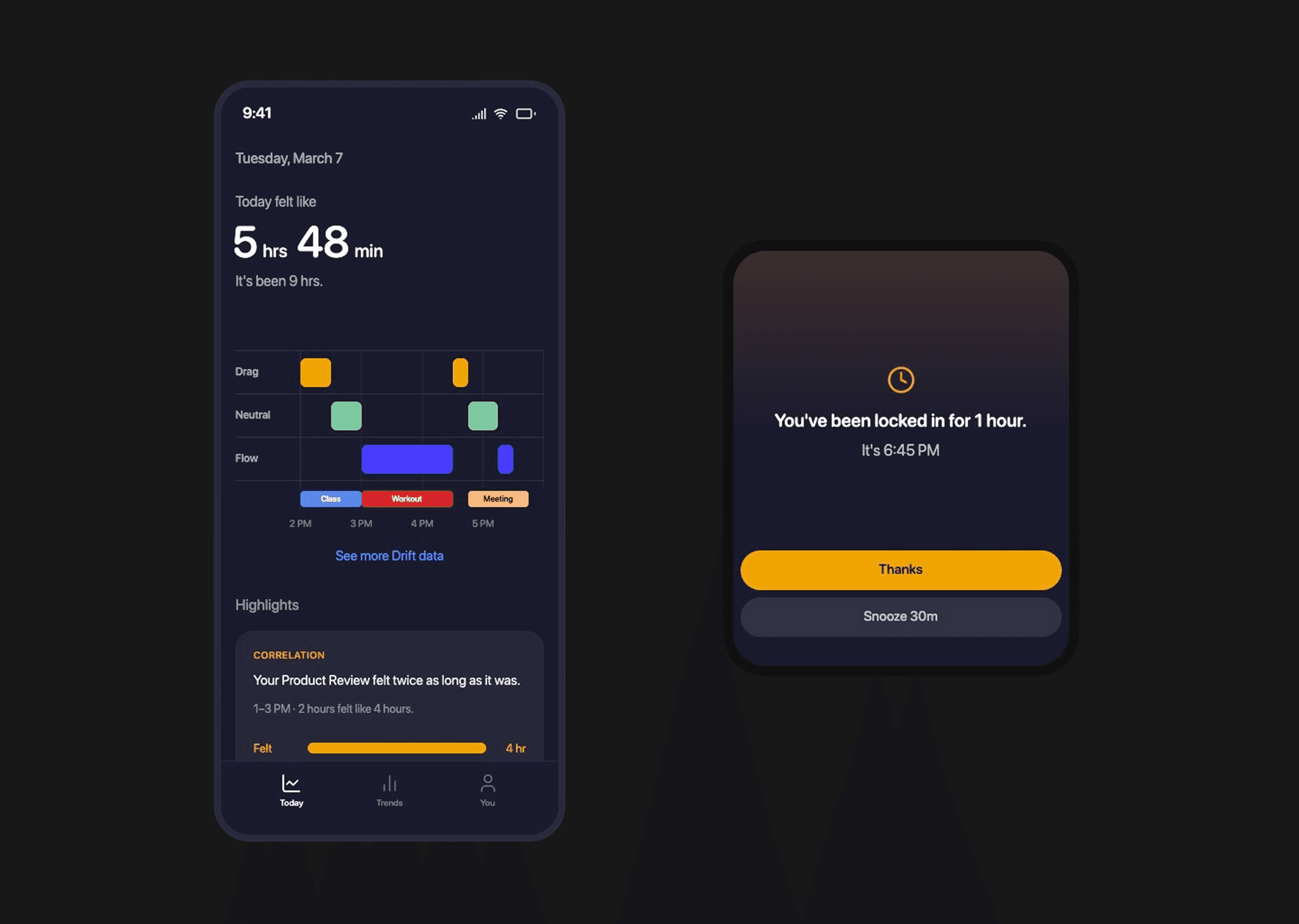 Drift tracks three states, each mapped to a distinct color: Flow (Indigo) — Time compresses. Hours feel like minutes. For ADHD, this is where hyperfocus lives — powerful, but sometimes a trap. Eight hours of gaming in Flow means missed meals and missed sleep. Neutral (Sage) — Time feels accurate. The clock matches perception. Present and balanced. Drag (Amber) — Time stretches. Minutes feel like hours. But a slow, peaceful morning in Drag is restorative, not a failure. Drift is a mirror, not a scorecard — it shows you your time and trusts you to decide what it means.