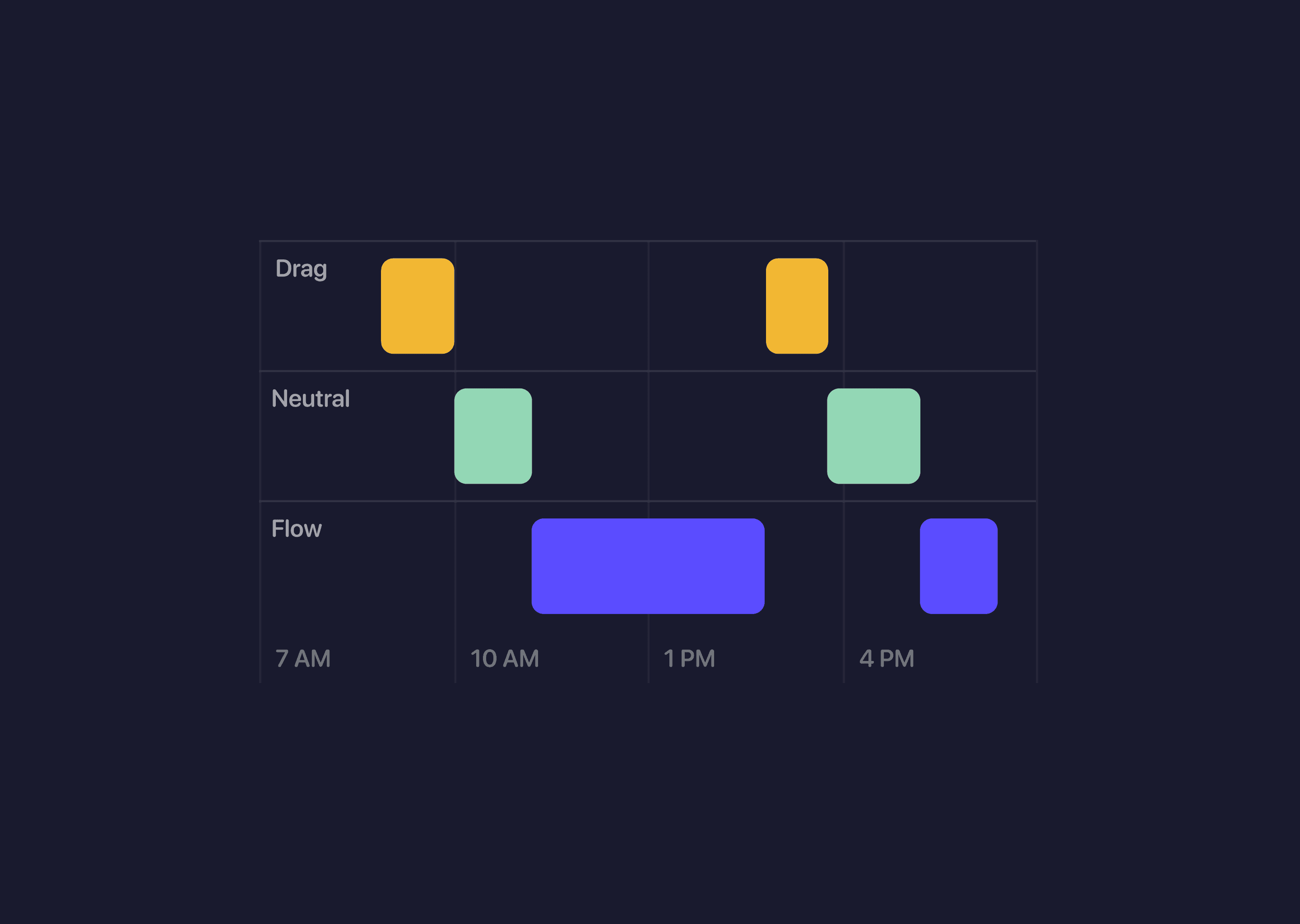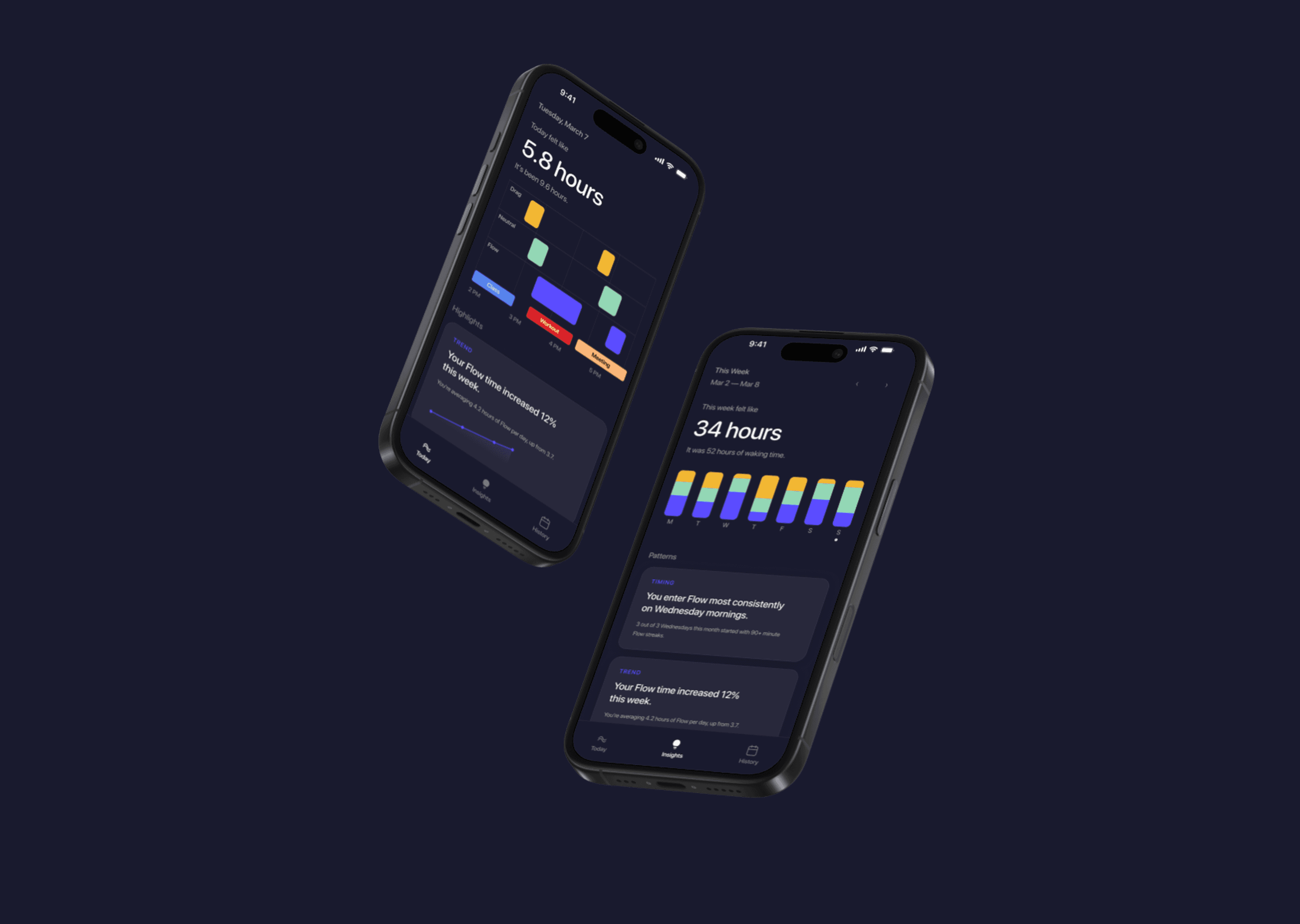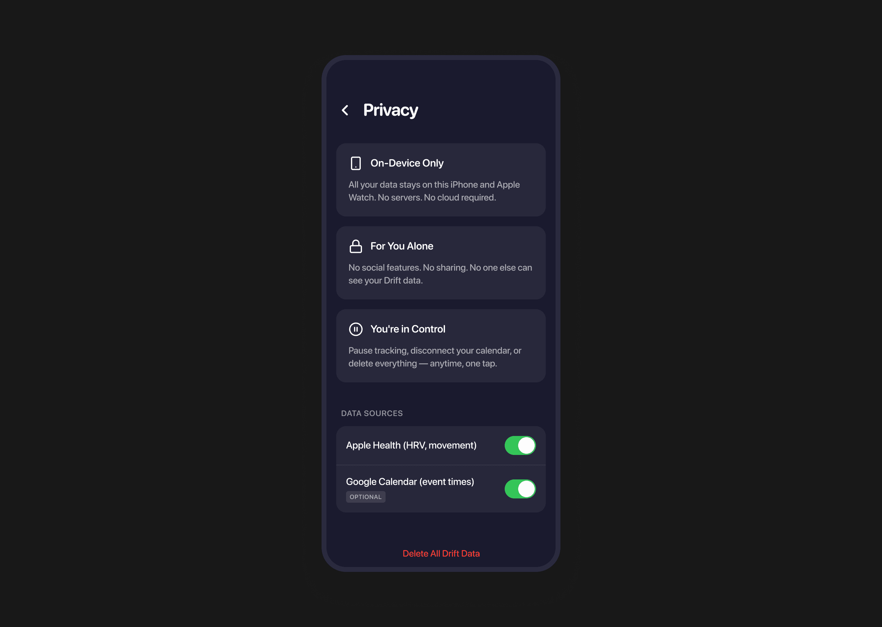 Drift tracks three states, each mapped to a distinct color: Flow (Indigo) — Time compresses. Hours feel like minutes. For ADHD, this is where hyperfocus lives — powerful, but sometimes a trap. Eight hours of gaming in Flow means missed meals and missed sleep. Neutral (Sage) — Time feels accurate. The clock matches perception. Present and balanced. Drag (Amber) — Time stretches. Minutes feel like hours. But a slow, peaceful morning in Drag is restorative, not a failure. Drift is a mirror, not a scorecard — it shows you your time and trusts you to decide what it means.